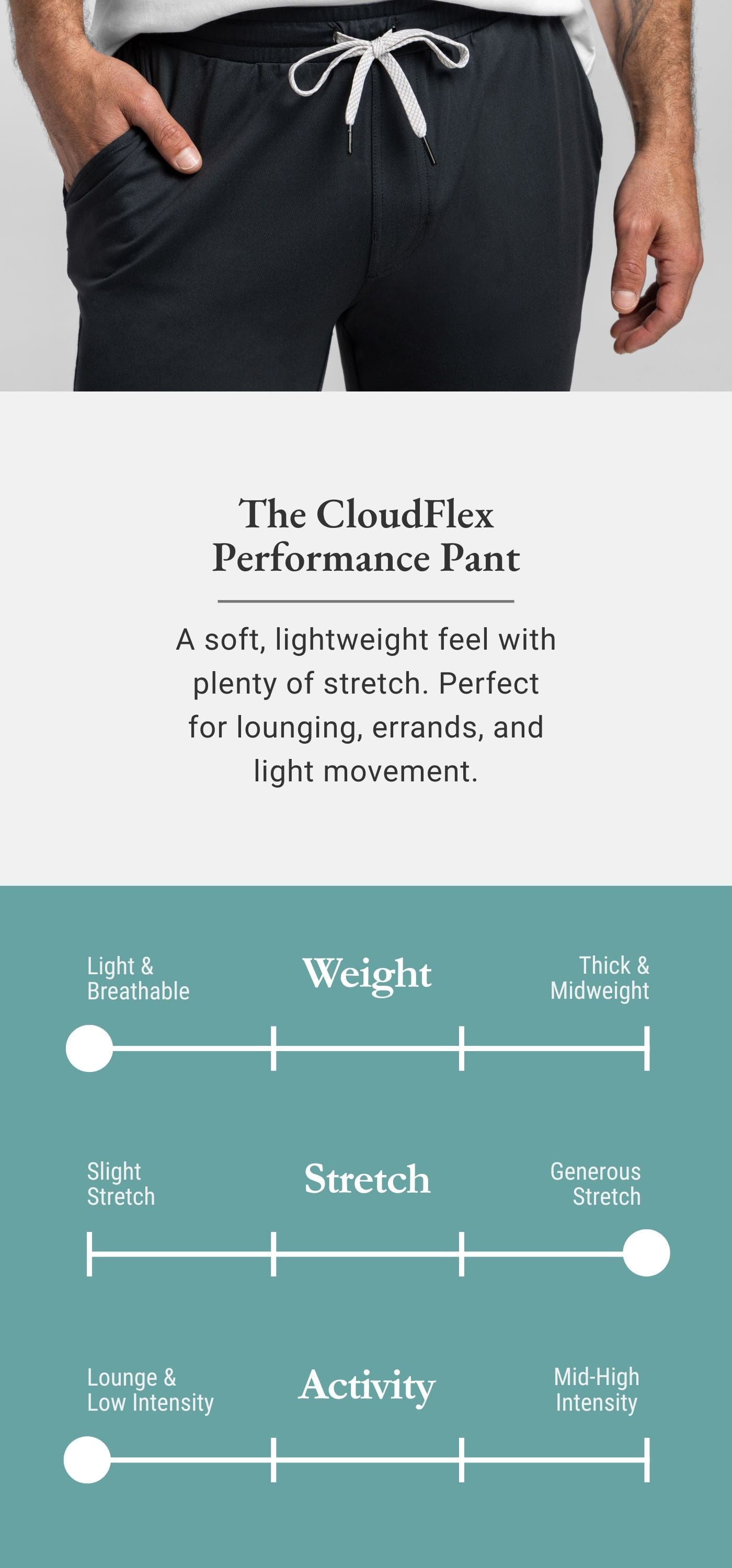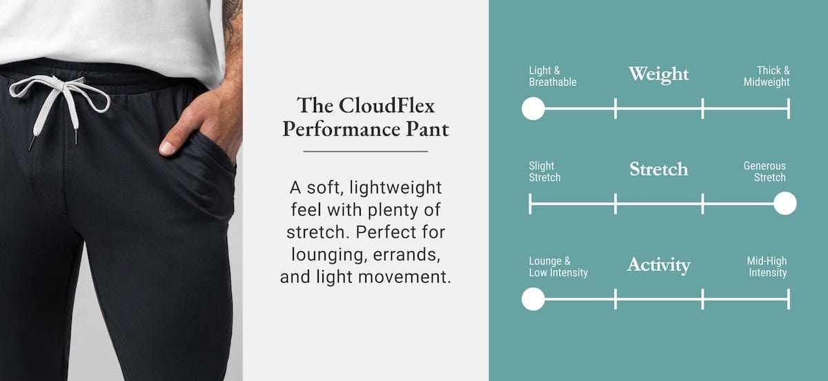 Unmatched comfort meets effortless style. Made with our new CloudFlex fabric, these ultra-soft, lightweight, and stretchy performance pants are designed for wherever the day takes you. Featuring a modern, slightly tapered leg, they’re perfect for travel, lounging, or tackling your daily routine in total comfort. Once you put them on, you won’t want to take them off.